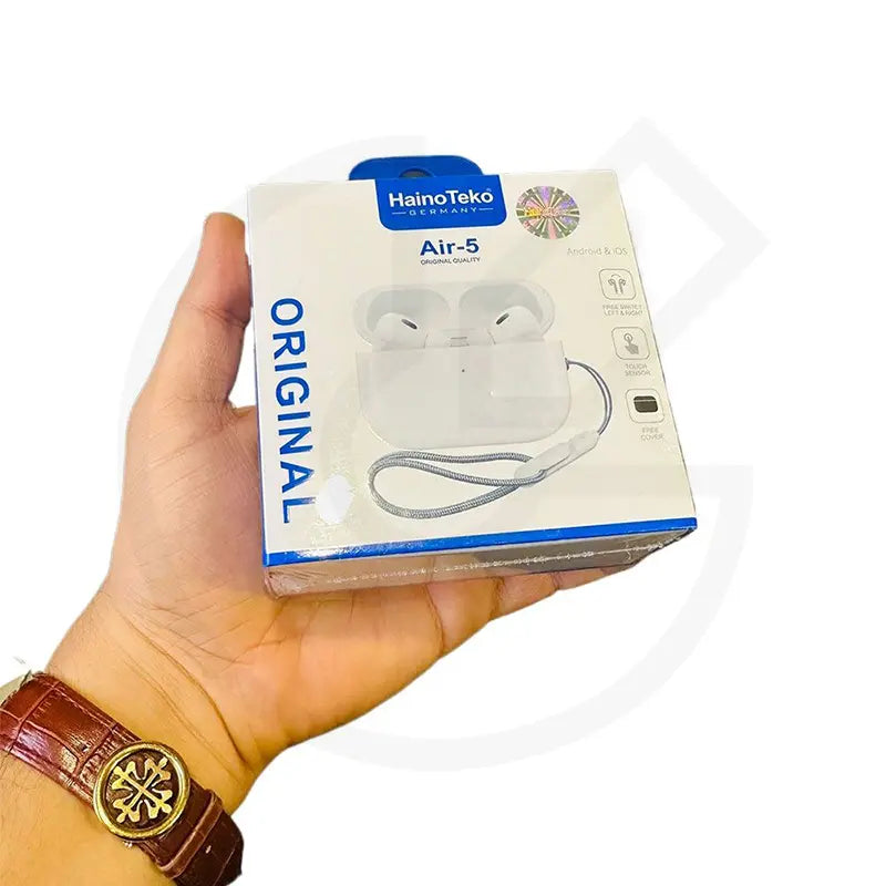 Experience premium sound quality and ultimate convenience with the Haino Teko Air-5 Wireless Earbuds, a high-end model from Germany. Designed for compatibility with both Android and iOS devices, these earbuds deliver crisp, clear audio with deep bass for an immersive listening experience.